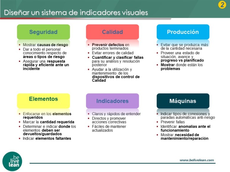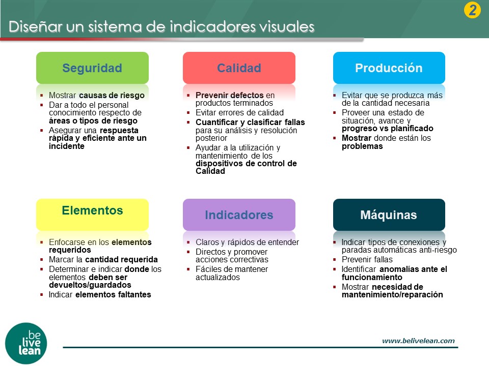 La implementación de esta herramienta, se consigue con sistemas de colores, señales verticales y horizontales, tableros informativos, luces, etc. Por ejemplo, los sistemas Andon indican mediante luces de colores el estado de los equipos y procesos de fabricación. Los Andon ayudan a los profesionales proporcionándoles rápidamente la información que necesitan para gestionar el proceso.
